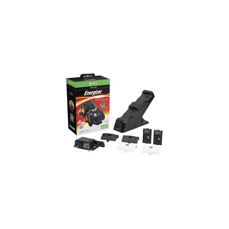 Un cargador conductor 2X para Xbox One con un adaptador de CA Adaptador de corriente para cargar rápidamenteIncluye 2 baterÃas de 700mAh Energizer RechargeCuenta con indicadores LED azul y verde para el estado de cargaTiene detalles mate y negro brillante y cromo. - Un cargador conductor 2X para la Xbox One con un adaptador de CA Adaptador de corriente para cargar rápidamente - Incluye 2 baterÃas de 700mAh Energizer Recharge - Indicadores LED rojo y verde para el estado de la carga - Tiene detalles negros y cromados mate y brillante